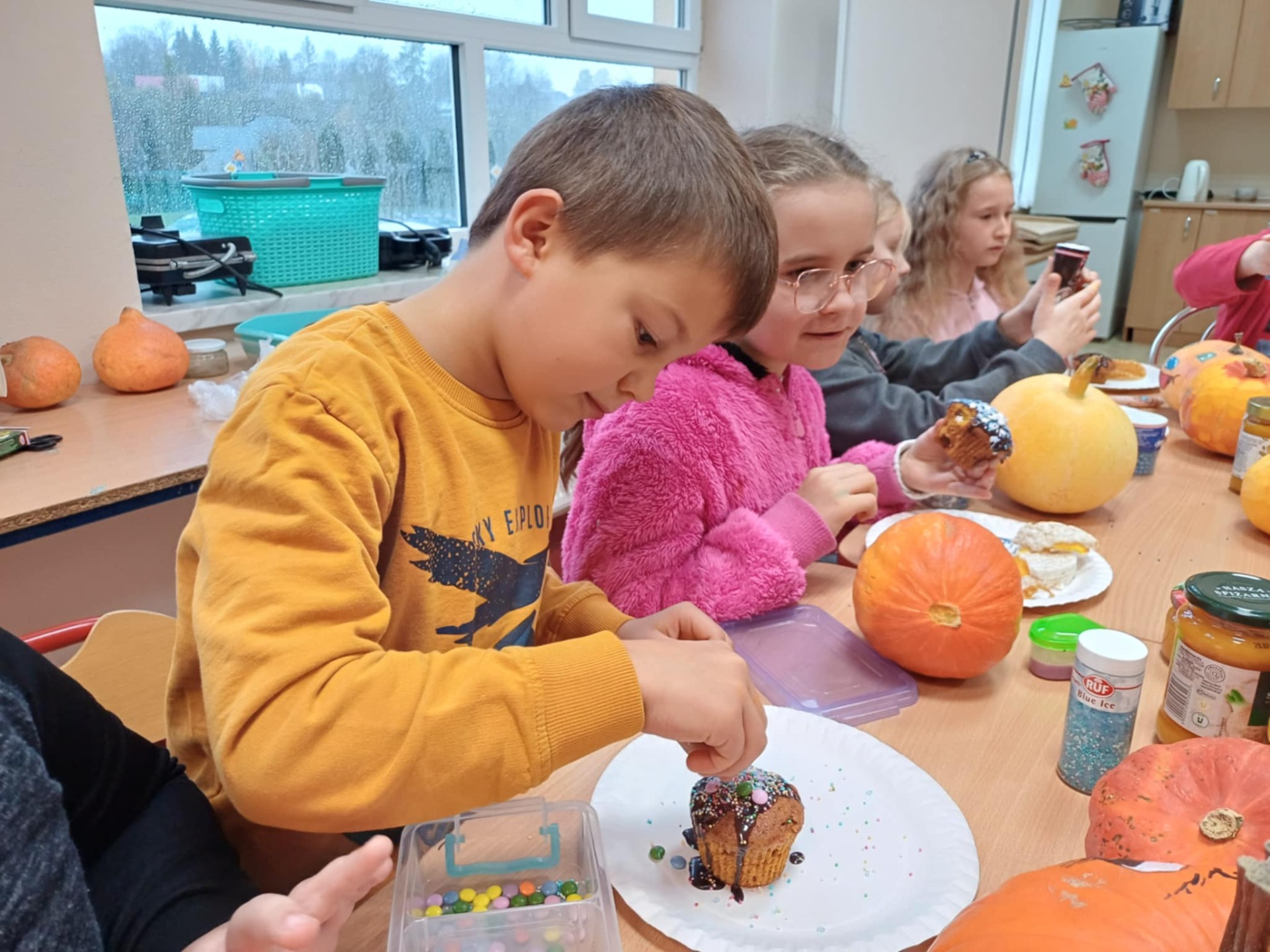 Na stołach pachniały gofry z owocami, dyniowe babeczki, domowy dżem z dyni, ciasto marchewkowe i pyszny sok marchewkowo – jabłkowy. Wszystko przygotowane własnoręcznie przez naszych małych kucharzy. 👩🍳🧑🍳