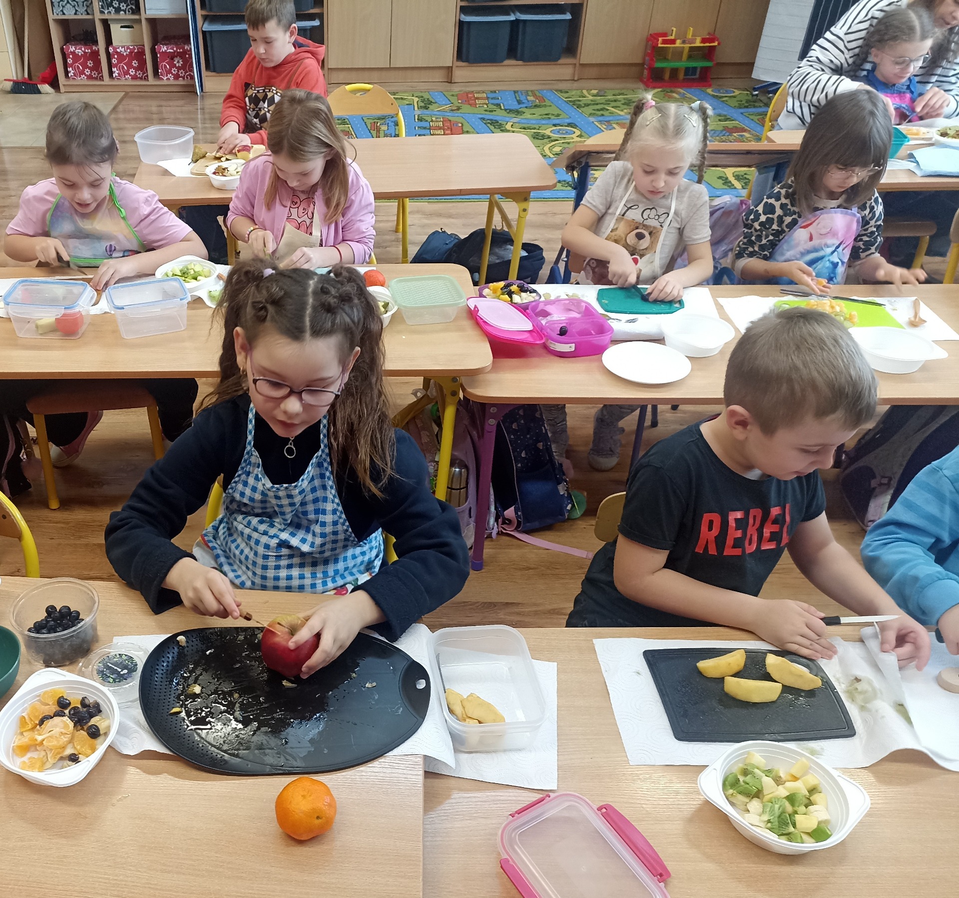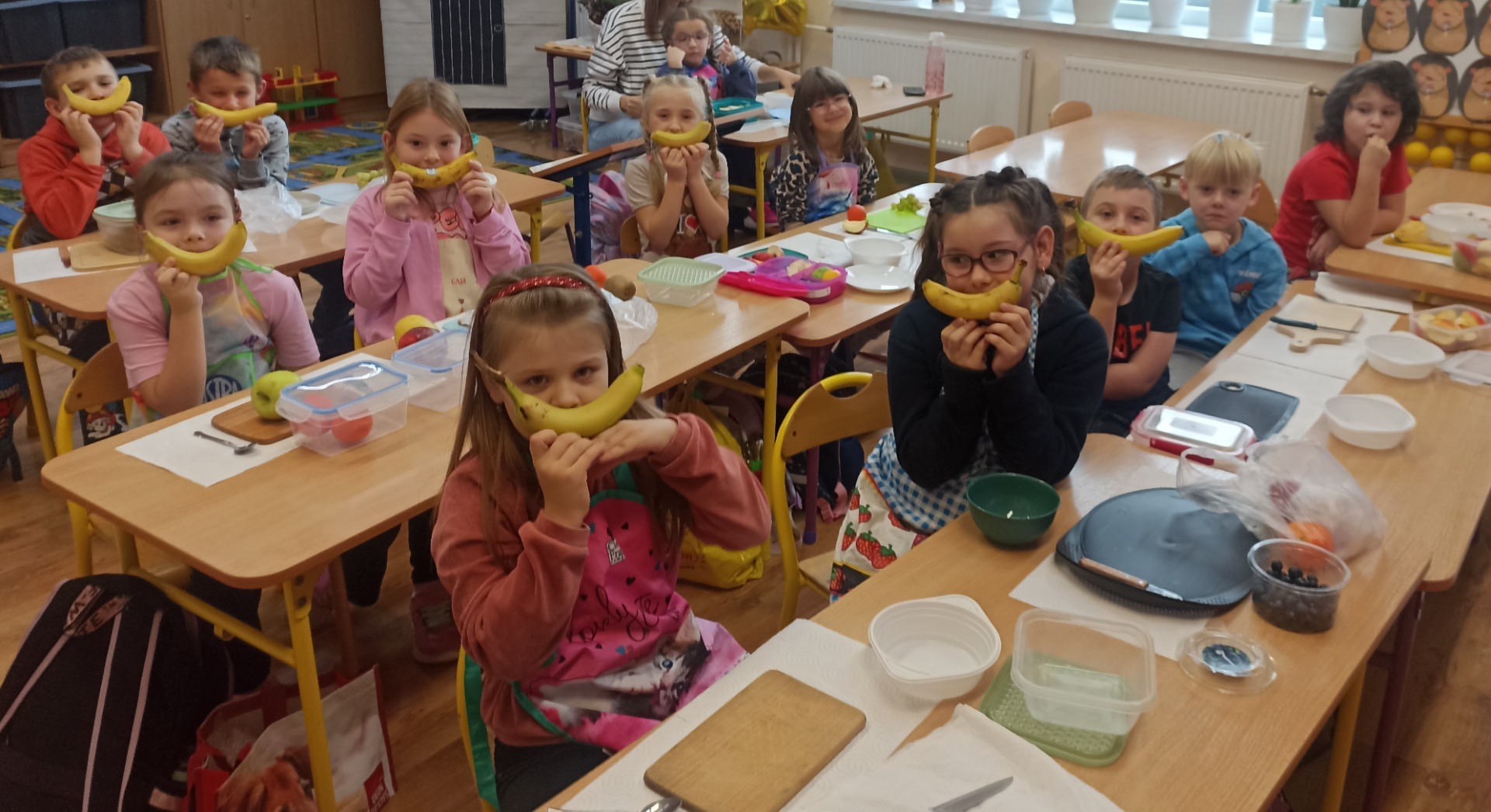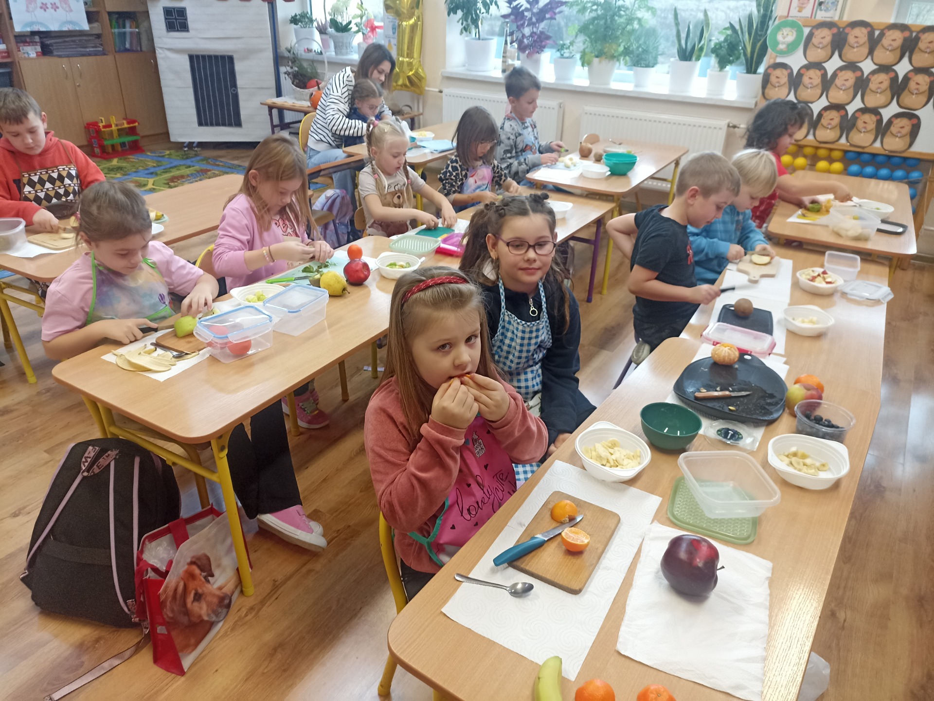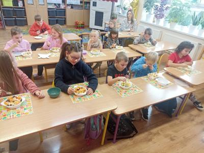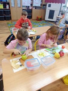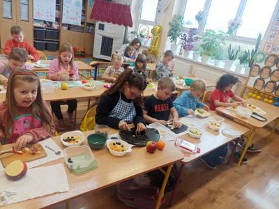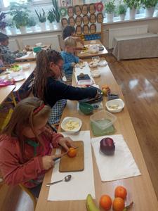 W ramach realizacji tematyki zdrowego odżywiania oraz realizacji „Programu dla Szkół" uczniowie klasy pierwszej przygotowali samodzielnie sałatkę owocową. Dzieci najpierw przypomniały sobie, dlaczego warto jeść owoce i jak wpływają one na zdrowie. Następnie każdy uczeń komponował swoją porcję, ucząc się współpracy oraz zasad bezpiecznego przygotowywania posiłków.