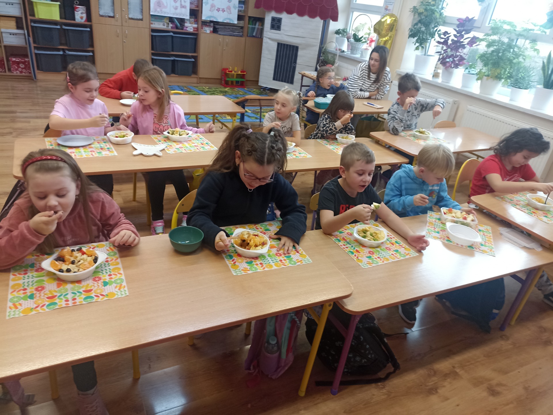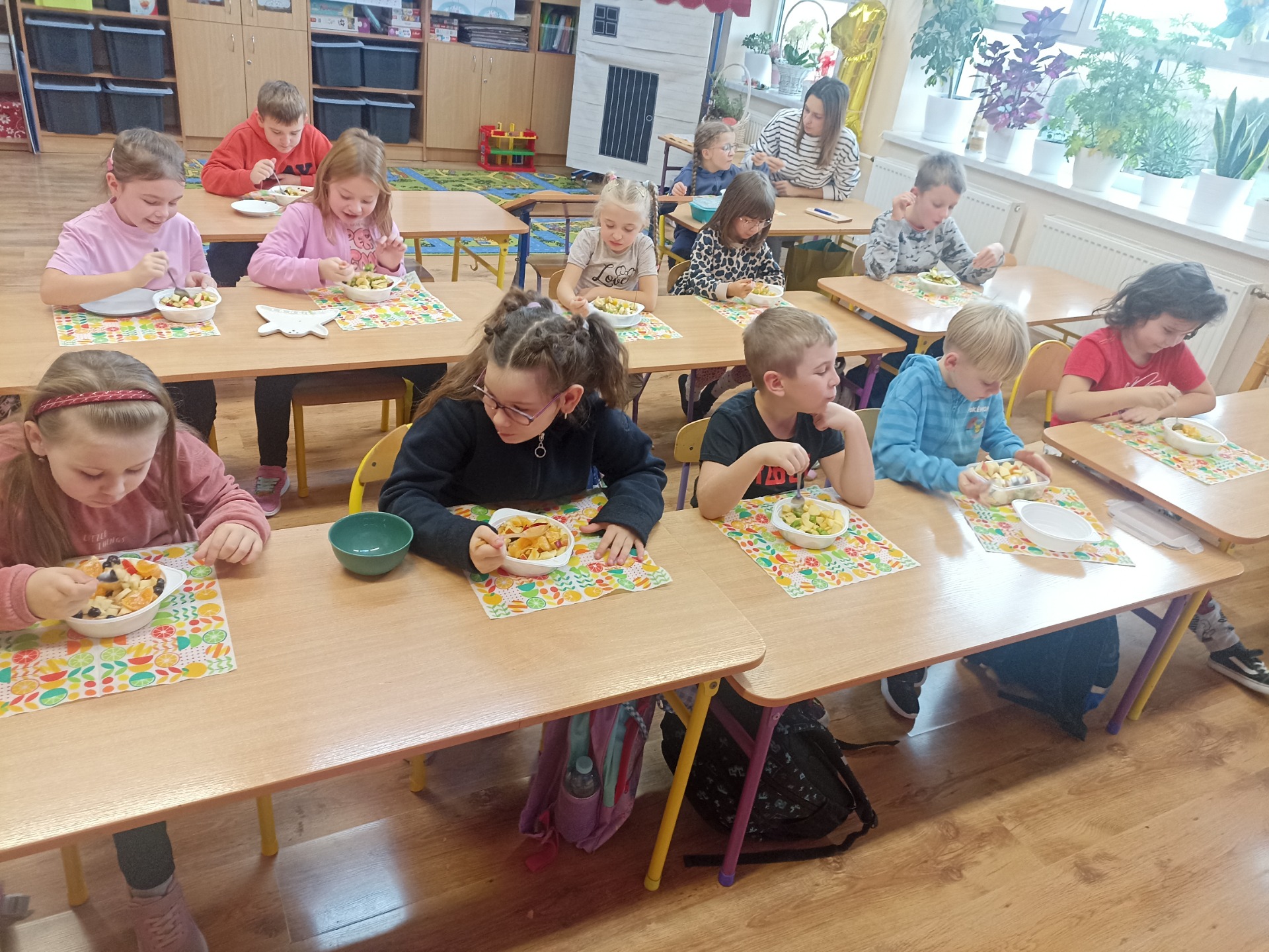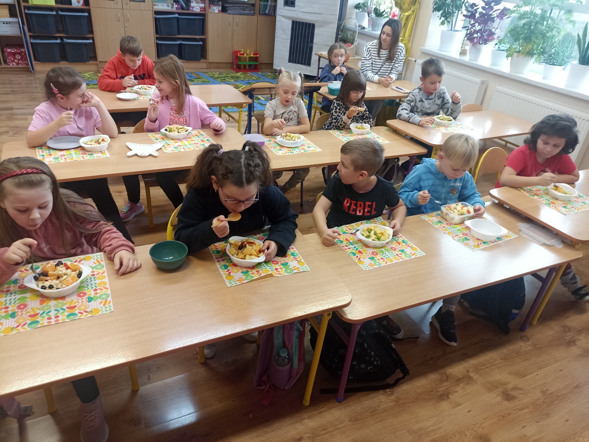 W ramach realizacji tematyki zdrowego odżywiania oraz realizacji „Programu dla Szkół" uczniowie klasy pierwszej przygotowali samodzielnie sałatkę owocową. Dzieci najpierw przypomniały sobie, dlaczego warto jeść owoce i jak wpływają one na zdrowie. Następnie każdy uczeń komponował swoją porcję, ucząc się współpracy oraz zasad bezpiecznego przygotowywania posiłków.